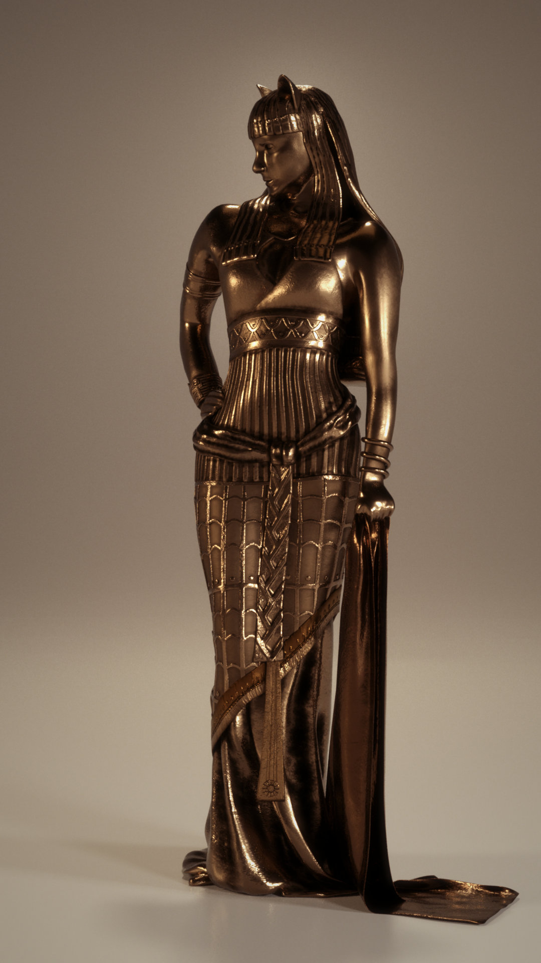 This here is Bastet, the Goddess of Protection in ancient Egypt. The famous cat symbol in Egypt refers to this woman. She was also the daughter of Ra, the sun god.