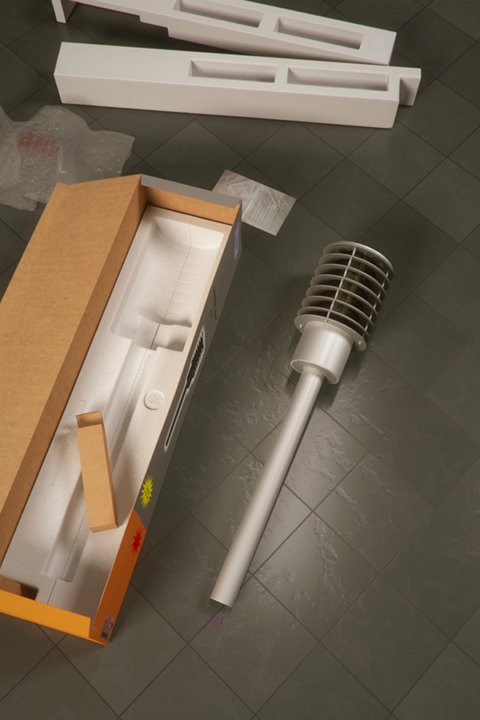 I was supposed to use this light post in another scene but I ended up removing it. I figured I’d create a scene for it, and this is it. The packaging was made just for fun to fill the scene. Some textures are from ImageAfter, the floor is Luxrender’s tile texture and the rest are created in Gimp.
